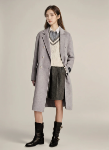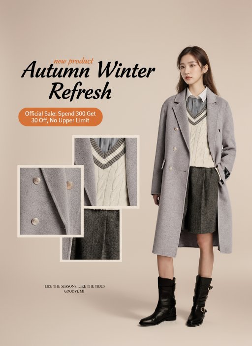 High-resolution fashion e-commerce poster featuring the uploaded model photo as a cut-out subject with transparent edges, not inside a rectangular photo frame.Create a modern seasonal fashion poster with a warm beige-to-pale peach full-canvas gradient background.Place the cut-out model on the right side so the figure naturally blends into the poster background.On the left side, design a stylish collage grid composed of multiple cropped detail shots of the same model’s outfit—close-ups that highlight key garment textures, trims, and accessories.Keep the number of grid blocks limited and well-balanced to achieve a refined, editorial look rather than a busy mosaic.Use subtle overlapping or varying block sizes to give the grid a modern, magazine-style design sense.Add bold English headline text “Autumn Winter Refresh” in large black calligraphic font with a small handwritten orange overlay text “new product”.Below, add a rounded orange rectangle label with the text “Official Sale: Spend 300 Get 30 Off, No Upper Limit”.Decorate with small English serif text like “LIKE THE SEASONS, LIKE THE TIDES” and “GOODBYE MI”.Keep the overall style clean, fashionable, and youthful, with subtle shadows and a trendy magazine-like layout.