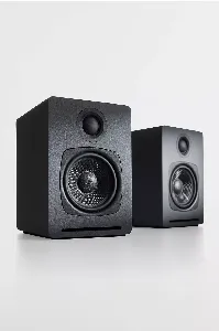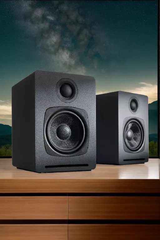 A black soundbar placed on a wooden surface in front of a television. The soundbar has a sleek, minimalistic design with a few control buttons on top. The background features a scenic view of mountains under a starry sky displayed on the TV screen.