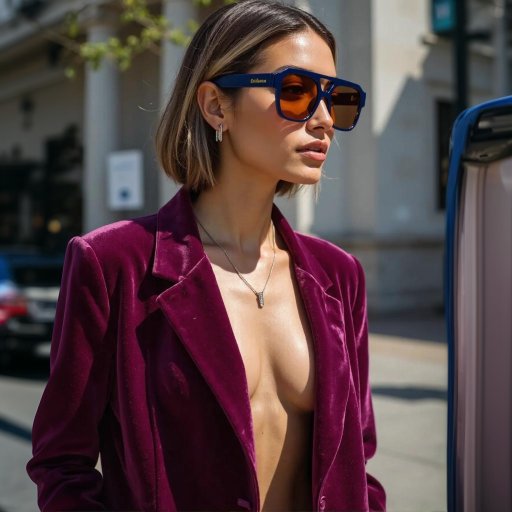 A model confidently walks down a runway, showcasing stylish sunglasses. The camera pans around the model, highlighting the sunglasses from different angles as the background changes from a cityscape to a beach.