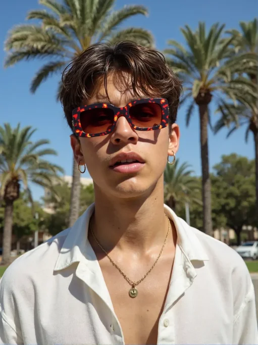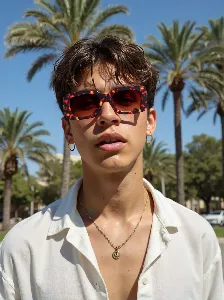 The model walks through a bustling city, turning heads as they wear the sunglasses. The camera follows them, capturing reactions from passersby and close-ups of the sunglasses as a bold fashion statement.