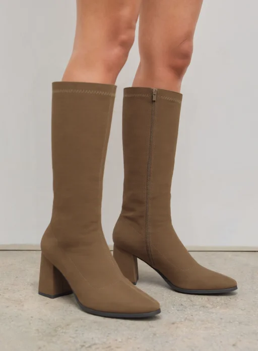 The model walks in a circle around the camera, showcasing the shoes from all angles. The camera remains stationary, panning slightly to follow the model. End with a close-up of the shoes as the model stops.