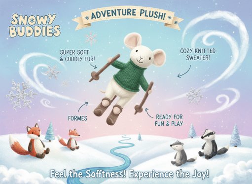 Generate a fun, childlike illustration promotional poster, including the product brand name, product features, and product information. The text should be clear and highlight the plush texture of the doll.
