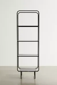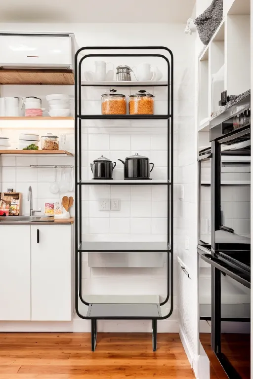 A black metal shelving unit with four shelves filled with various kitchen items, including jars, utensils, and food containers. A metal chair is beside the shelf, and a black stove is in the background. There is a white kettle on the stove and a wall with colorful food-related posters. A pink cloth hangs nearby.